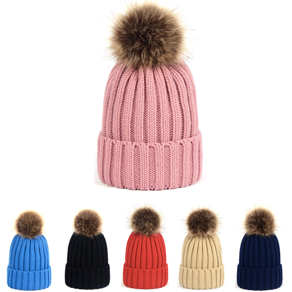 This beanie is made of 100% acrylic. Soft, comfortable and great for winter. This knit beanie cap has a fun faux raccoon fur pom pom and an adjustable cuff that folds to approximately 2" and it stretches fit adult and teen sized heads. It's perfect for your next snow trip. A custom logo is available.
